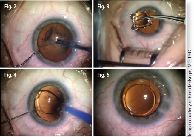 Figures 2-5. C-MICS with the Akreos MICS lens is Dr. Malyugin's procedure of choice for routine cataract surgery. However, he finds it works well in complicated cases as well. For example, he has implanted the IOL in patients who had previously undergone radial keratotomy, as shown here.