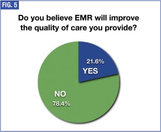 Asked if they thought EMR adoption would improve the quality of care they provide, 78.4% of our respondents said no (see Figure 5). Inflexibility in data recording and reporting requirements seem to be concerns of many. “When I get EMR records from other offices, I receive seven pages for each office visit, most of which are default entries,” one ophthalmologist told us. “Each office visit notes that the lashes were examined. We all know that's not true. It's just the computer default printout when the doctor/tech doesn't alter the templated data.”