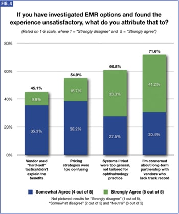 To hasten the transition period, EMR systems must be as flexible and adaptable as possible. However, 61.8% of respondents said the EMR systems they had tested were not user friendly, and 60.8% said that were not tailored to ophthalmology practice. “We are very paper dependent and have fear of the conversion process,” wrote Christopher Wood, MD, of Arlington Heights, Ill. “Our future EMR needs to have excellent support and be very user friendly to make the process less onerous.”