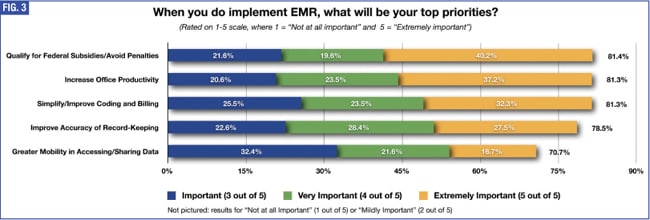 The third-most significant factor seen as a reason to delay EMR in our survey was lack of details on requirements an EMR system must include to allow practices to obtain the incentive payments. “With so many current systems and no firm government standards issued, which vendors will survive?” wrote one reader from New York. “I would hate to make a $70K decision only to find that the software isn't government approved and the vendor just abandons ship.” Still, 81.4% of respondents said their top priority when adopting EMR will be to qualify for payments/avoid penalties, and nearly half of them considered it “extremely important” (see Figure 3).