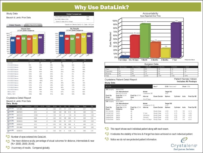 To provide surgeons with real-world outcomes data, Guy Kezirian, MD, has created a database called the SurgiVision DataLink IOL Edition that tracks comprehensive premium IOL outcomes in a collaborative data registry. Data-Link, which is sponsored by Bausch & Lomb, compares IOL outcomes from all manufacturers in an easy-to-use online interface. Outcomes measures include spherical equivalent, and monocular and binocular visual acuity at distance, intermediate and near vision. Users receive customized reports that compare their practices outcomes to the global pool of users (see Figure 1). Over 70,000 IOLs have been entered into the database; participation is voluntary.