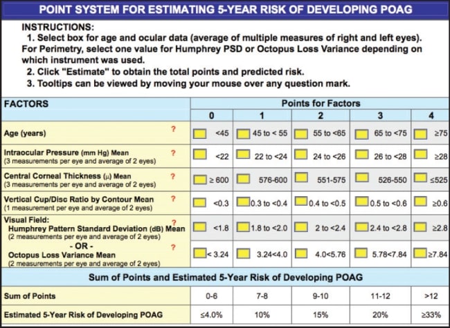 Figure 1. The calculator estimates POAG risk using the patient's clinical data over several visits (above) or by comparing data to averages for several risk factors and assigning point values to each (below).