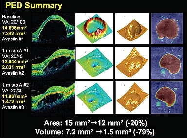 Figure 17-18. A soon-to-be-released algorithm for the Cirrus HD-OCT will allow automatic area and volume measurements of drusen and pigment epithelial detachments. In this case, even though the area of the PED does not appear to be changing significantly, treatment has decreased the volume of the PED by nearly 80%.