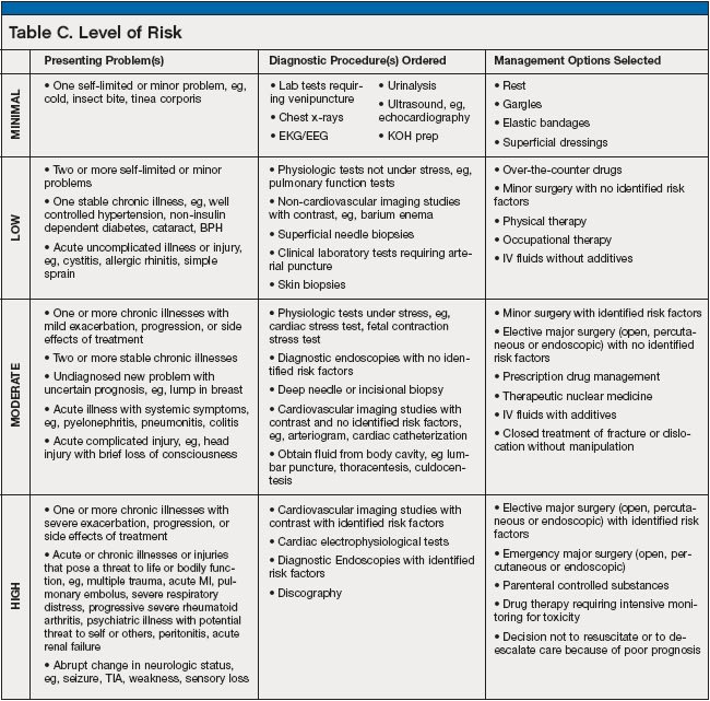 When selecting the level of risk, think outcomes. What is the chance/likelihood that this patient will or will not have a good result? Keep in mind you are coding for that particular office visit/consultation.