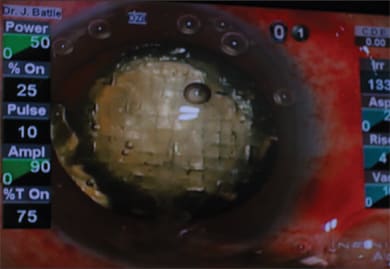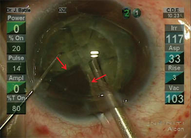 Figure 6. Femtosecond laser facilitated aspiration of first quarter of presegmented and softened grade four cataract.