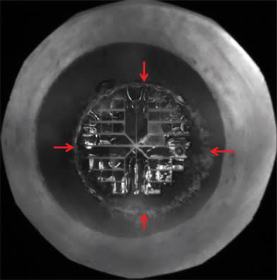 Figure 3. Perfectly sized (5.0 mm) and positioned, round anterior capsulotomy (red arrows) with four-quadrant segmentation and softening (0.5 mm cubes) created by femtosecond laser.