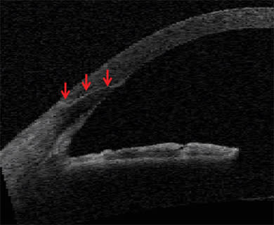 Figure 2. Clear-corneal incision made by the femtosecond laser (red arrows) with perfect tongue and groove apposition of edges of the incision).