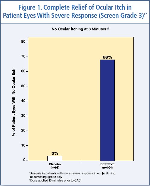BEPREVE demonstrated rapid onset of action in the trials, with 95% of patients achieving clinically significant relief of ocular itch within 3-7 minutes after instillation of a single drop.7 This response was also durable, lasting at least 8 hours in 90% of eyes treated with BEPREVE.7 Furthermore, BEPREVE was rapidly effective against severe itch in these studies, with 68% of patients reporting complete relief (0 itch) of their severe symptoms at 3 minutes compared to only 3% of patients using placebo drops (Figure 1).8