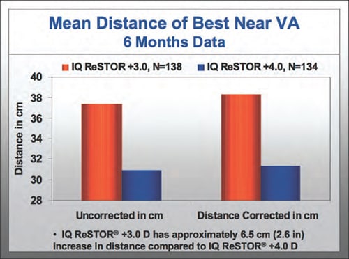 The purpose of the study that led to FDA approval of the AcrySof IQ ReSTOR IOL +3.0 D was to confirm that the increase in the distance of near vision it provides didn't negatively impact near or distance visual acuity or visual disturbances compared with the IQ ReSTOR IOL +4.0 D. The pro-spective, randomized, patient-masked clinical trial, which involved 279 patients at 12 centers, confirmed this.