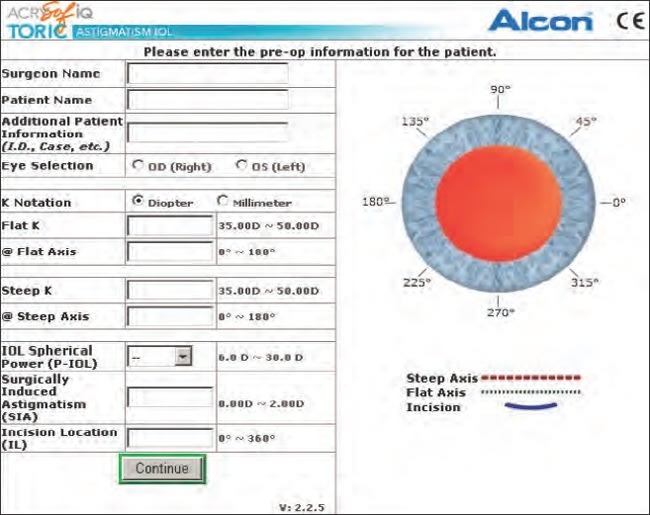 Pre-op patient information can be entered on this screen within the toric calculator to obtain an automated calculation of the required lens power.
