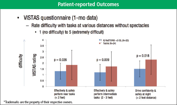 As we've found in this study on a preliminary basis, however, these notions about ideal lenses for patient types may be changing. We found what we expected in multifocal patients. Patients noticed night vision symptoms more prominently in the Tecnis +4.0 D Multifocal IOL than in the AcrySof IQ ReSTOR IOL +3.0 D lens. What was a surprise, however, was that all patients in both lens groups noted decreased reading ability in low illumination. The incremental improvement in low illumination didn't make an impression.
