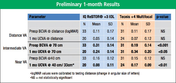 With these factors in mind, we've begun the first, prospective, randomized comparison between the AcrySof IQ ReSTOR IOL +3.0 D and the Tecnis +4.0 D Multifocal IOL. In the trial, 62 cataract surgery patients were randomly assigned to bilateral implantation with one of these lenses. A 1-month post-operative follow up has been recorded and a 3-month follow-up is planned.