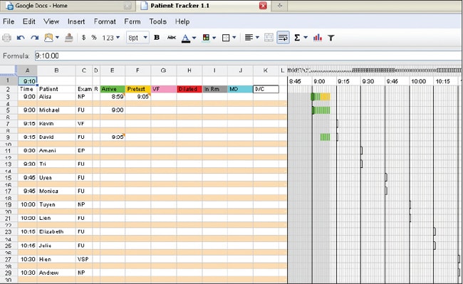 The Patient Tracker application described in this article uses a shared Google spreadsheet. It allows for real-time, graphical, intra-office communication of where the patients are and how long they have been spending in each phase of their respective appointments.