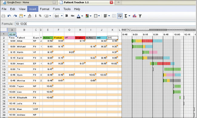 Patient Tracker has allowed me to see more patients, decrease patient wait times, and have a better overall view of my office. It can be useful not only in ophthalmology, but also in any medical setting, especially those such as urgent care centers and emergency rooms in which a patient's visit may involve tests or procedures that differ depending on the diagnosis. There may be many non-medical applications as well (restaurants, DMV offices, hair salons, etc.). And best of all, it is free for downloading from Google Docs—a very apropos name, I might add. OM