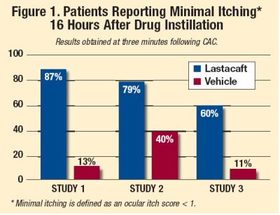 To determine how quickly the medication works, the subject is pretreated with the test agent 15 minutes prior to the known allergen challenge. Itching scores are reported at three, five and seven minutes post challenge. In order to determine the duration of effect, test agent is instilled 16 hours prior to allergen challenge and again itching scores are recorded at three, five and seven minutes post challenge. Three randomized, placebo-controlled trials (n=274 patients) demonstrated that Lastacaft significantly reduces itching compared to vehicle. The onset of the therapeutic effect was found as early as three minutes post CAC. The duration of therapeutic effect was shown for at least 16 hours following Lastacaft dosing (Figure 1).1-3
