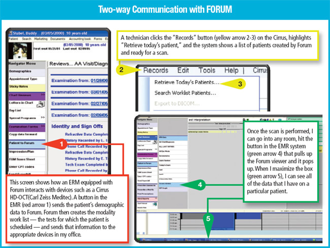 The problem with unidirectional transfer was that technicians duplicated data entry, increasing the chances of error. Now, with EMR and Forum combined, a patient enters the office and checks in. His information is entered at the front desk, and when he needs to undergo tests—visual fields, OCT or others—his information goes from the EMR to the device. Technicians don't have to retype it into each machine. The test results are then sent to Forum and accessed with the EMR.