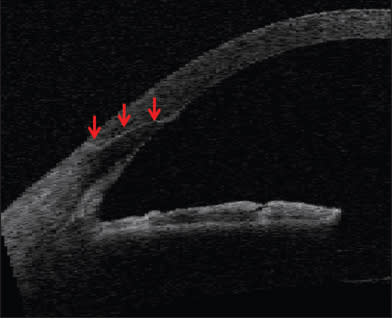 A clear-corneal incision made with a femto laser is indicated at the red arrows. IMAGE COURTESY OF WILLIAM CULBERTSON, MD.
