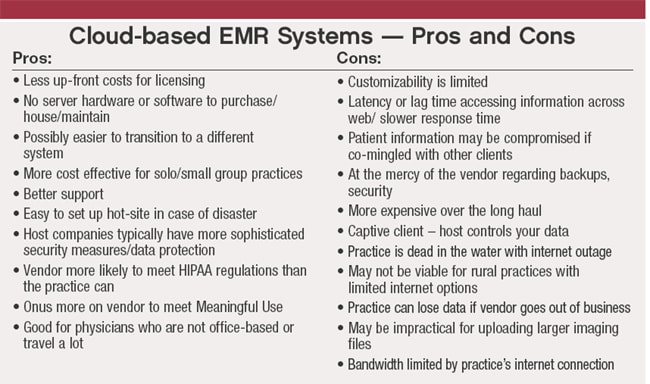 If cloud-based systems are cheaper to set up, why doesn't everyone go this route? Mr. Messier points out that, similar to deciding between leasing or purchasing a car, it helps to crunch the numbers. And for many practices that commit to a long-term relationship with their EMR system, there is usually a better return on investment for most practices to buy the EMR system rather than pay a monthly access fee, with a typical break-even time of about five years. OM