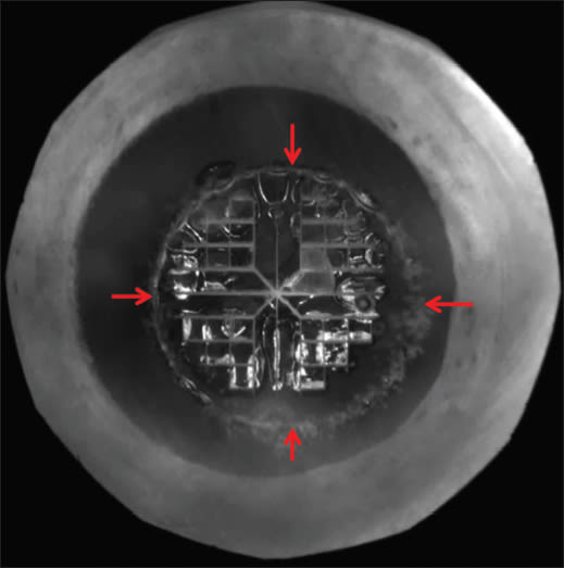 Perfectly sized (5.0 mm) and positioned, round anterior capsulotomy (red arrows) with four- quadrant segmentation and softening (0.5 mm cubes) created by a femtosecond laser.