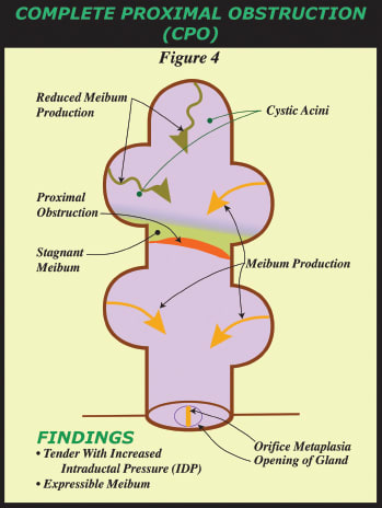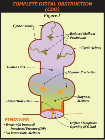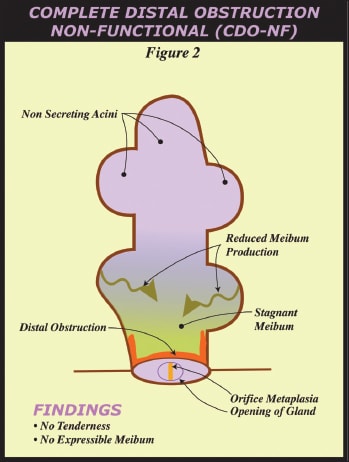 • Partial Distal Obstruction and Complete Distal Obstruction-NonFunctional. Lids without tenderness may or may not have at least five glands with expressible meibum. If a lid has at least five glands with expressible meibum and orifice metaplasia, but no lid tenderness, it is described as having a “partial distal obstruction or PDO” while a lid without expressible meibum from 5 glands and no lid tenderness is a “complete distal obstruction-nonfunctional or CDO-NF. In this case, meibum is not expressible so the obstruction is complete and distal. It is proposed that the glands are not generating meibum sufficient to elevate intraductal pressure causing lid tenderness.