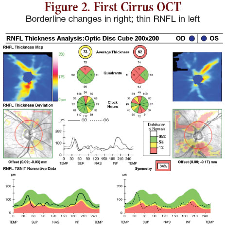 • Glaucomatous changes in left eye and suspicious changes in right eye