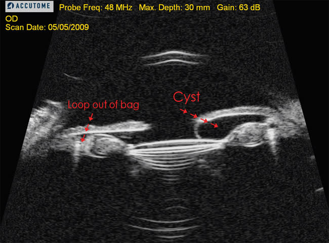 The device is said to accommodate a range of demands, including angle evaluation, measuring sulcus-to-sulcus distance for sulcus-supported IOLs, and imaging of the iris and ciliary body cysts or tumors. One of the primary uses for UBMs in Dr. Fram's and Dr. Masket's office is evaluating pathology caused by malpositioned PCIOLs.