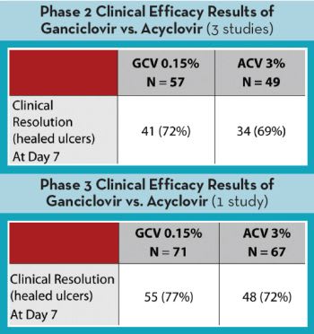 Dr. Donnenfeld: Four studies led to FDA approval of ganciclovir. Three were comparative, randomized clinical trials, and one was an open-label trial. All studies evaluated ganciclovir vs. acyclovir ophthalmic ointment 3%, a third-generation antiviral very similar to ganci-clovir, that has gained favor around the world but is not available in the United States.