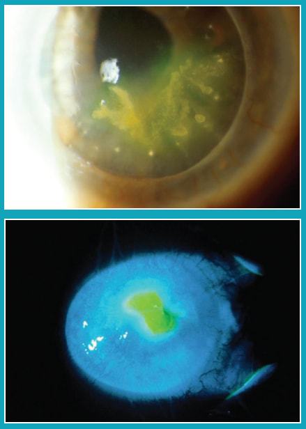 First, infectious epithelial keratitis can present with four types of lesions: corneal vesicles, dendritic ulcers, geographic ulcers and marginal ulcers. The prodrome to the dendritic ulcer is the eruption of the virus on the corneal surface in vesicles. The vesicles, which contain active virus, coalesce to form a dendritic ulcer. Fluorescein reveals the absence of stain because the epithelium is still intact, but you will see late staining through the abnormal epithelium. The vesicles coalesce to the dendritic ulcer lesion classically with swollen borders, and then the center part of the lesion ulcerates into Bowman's layer. This dendritic ulcer is what most clinicians recognize as the clinical presentation of HSV keratitis.