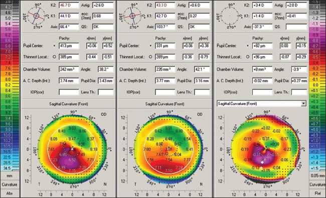Figure 4. This is a Pentacam comparison of the right eye. The column on the left shows pre-tgPRK/CXL data and topography. The central column shows postop data and topography. The right column shows the difference of pre-treatment minus the post-treatment. The planned correction was −2.50, −2.50x45 after a 6 mm in diameter, 50 µm PTK. Using a moistened weck-cell, 0.02% MMC was applied after the ablation onto the stroma for 20 seconds. In January 2010 (11 months following treatment) the UCVA was 20/30, the CDVA (BSCVA) was 20/20-1 with −0.50 −0.75x141. Keratometry was 43.3/42.7x103. Pachymetry was measured at 330 µm. The difference map of pre and post treatment is noted in Figure 4. The endothelial cell count was unchanged at 20 months (2650 to 2600). The corneal OCT of the central cornea in the OD at 11 months is seen in Figure 5. The hyper-reflectivity of the anterior two-thirds of the cornea suggests the CXL effect, as we have reported previously, in applying similar treatment in keratoconus cases.10 The hypereflective demarcation in the middle of the cornea in this case suggests a very thick LASIK flap calculated to over 200 µm.