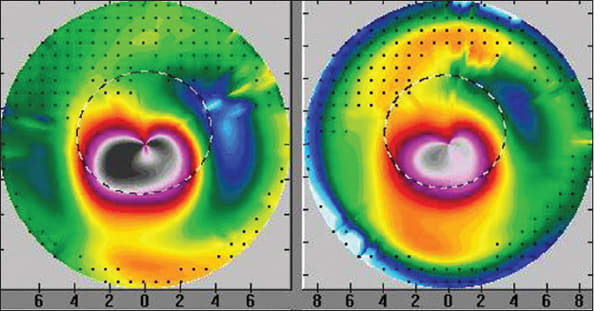 Figure 2. The topography on the left is prior to the tgPRK/CXL treatment with marked inferior steepening. The topography on the right shows the same cornea 16 months after tgPRK/CXL with marked flattening of the ectasia and cornea normalization. • Patient 3: Post-LASIK ectasia only in one eye, treated with tPRK/CXL in one session, the other eye observed. A 26-year-old male helicopter pilot underwent LASIK in both eyes in June 2004. None of the operative data was available to us. The only detail available for the initial LASIK procedure is that he was “about” −3.0 D myopic in both eyes prior to the LASIK surgery. His UDVA (UCVA) for the initial two years post LASIK was “good” and then deteriorated in his OD. He was subsequently diagnosed with ectasia and was offered Intacs or a corneal transplant. We first evaluated him in September 2007 three years after the LASIK surgery. The UDVA (UCVA) was 20/40 OD and 20/15 OSD. The manifest refraction was +1.50 −2.00x65 OD (20/20) and plano OS (20/15). The keratometry readings were 41.62x6/ 43.62x155 OD and 41.75/42.12x10 OS. The central ultrasonic pachymetry was 476 µm OD and 490 um OS. In September 2007, 39 months after the LASIK procedure, we performed a combined topography-guided PRK and immediate CXL in the OD for +0.50 −1.50x60. The planned laser resection was 35 µm. The pre-treatment manifest refraction was +1.50 −2.00x65; we reduced the attempted sphere and cylinder, anticipating a subsequent flattening effect of the sequential CXL procedure. Within six months the UDVA (UCVA) improved to 20/25; 24 months later in September 2009, the UDVA (UCVA) improved to 20/15 and the manifest refraction improved to plano −0.25x05 (20/10). The keratometry readings in the OD were 43.00/ 43.25x07 and the ultrasonic pachymetry was 441 µm. The difference maps (Pentacam) between the pre tgPRK/CXL and two years later are displayed in Figure 3. At three years follow-up, UDVA (UCVA) remains at 20/10. As a result of the improvement and stability of his visual function, this young man has recently went on to join the United States Air Force as a fighter pilot currently serving in active duty.
