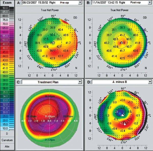 Figure 3 summarizes the clinical course of the right eye. Topographic image 3A shows the topography of the right eye three years following the LASIK procedure with irregular astigmatism and marked inferior cornea steepening. UCVA 20/40 and BSCVA with +1.50 −2.00x65 20/20. Image 3B shows the topography three months after the tgPRK/CXL procedure. The topography here is flatter and quite normalized. Uncorrected visual acuity is 20/15. Image 3C is a topographic reproduction of the topography-guided PRK treatment plan with the Wavelight platform used. This platform is planning to remove tissue in an irregular fashion in order to normalize the cornea ectasia seen in 3A. Image 3D (A minus B) is a comparison map derived from subtracting image B from A and represents the topographic difference in this case three months after the combined treatment. The paracentral flattening is self explanator,y as the PRK and CXL have flattened the cone apex. The superonasal arcuate flattening is quite interesting. It represents the actual part-hyperopic correction that the topography-guided treatment has achieved, in order to accomplish steepening in the area central to this arc. Thus, the treatment has normalized the ectatic cornea by partially flattening the cone apex and at the same time by “steepening” the rest of the central cornea. • Patient 4: Use of tgPRK/CXL despite thin residual stromal bed. This 32-year-old female underwent LASIK in both eyes in December 2006 for a refractive error of −3.75 OD and −4.00 OS. No other data were available in regard to the surgery. The vision was good for two years and then started to deteriorate. Her treating surgeon diagnosed post-LASIK ectasia in December 2008. We first evaluated the patient in January 2009. The UDVA (UCVA) was 20/100 in the OD and 20/20-2 in the OS. The CDVA (BSCVA) was 20/30 with −3.25 −3.25x45 and 20/15 with + 0.50 −1.25x100, respectively. The keratometry readings were 46.7/ 44.1x66 and 39.75/41.75x65, respectively. The pachymetry readings were 419 µm and 460 µm, respectively. The diagnosis of post-LASIK ectasia was confirmed by Pentacam maps in the right eye (Figure 4, left image). The patient was contact lens intolerant and opted to undergo tgPRK/CXL despite the informed consent that the estimated residual cornea thickness would be 360 microns. This procedure was performed in February 2009 in the OD.