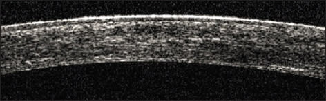 Figure 5. This is the OCT of the central cornea in the OD at 11 months post-tgPRK/CXL. The hyper-reflectivity of the anterior two-thirds of the cornea suggests the CXL effect. The hypereflective demarcation in the middle of the cornea suggests a very thick LASIK flap calculated to over 200 µm. |