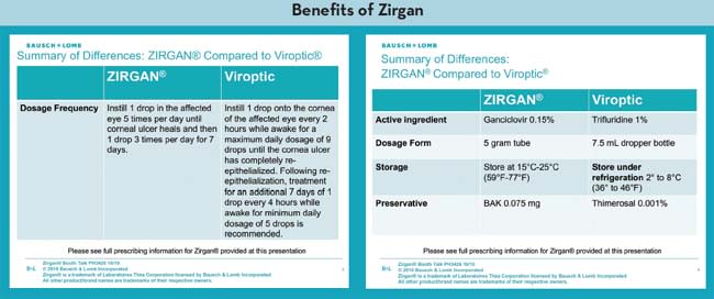 Zirgan also has an outstanding vehicle. The gel very readily applies to the eye. My patients tolerate this medicine well, particularly because the herpetic eye is frequently if not always to some extent neurotrophic and therefore more susceptible than a normal eye to the insult of a topical agent.