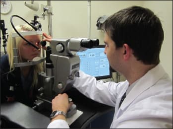 Dr. Dan Kiernan performs indirect ophthalmoscopy in an examination lane. Electronic medical records and digitalization of all imaging, including SD-OCT, facilitates follow-up.