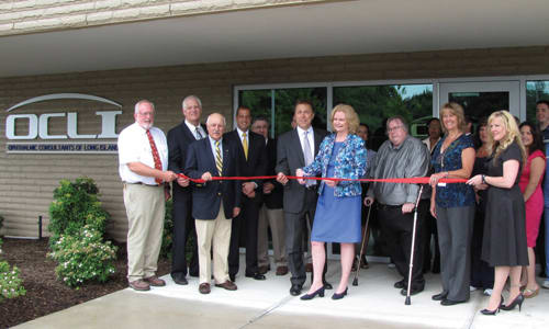 Ribbon cutting at eighth and the newest office, Port Jefferson. Dr. and Mrs. John Wittpenn with local dignitaries and office staff.
