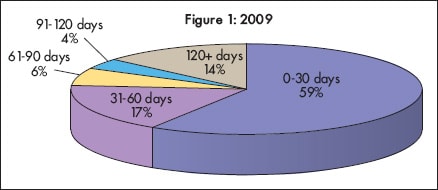 Accounts receivable findings: Benchmarks for Accounts Receivable include Aging Analysis and Net Collections Ratio. Aging Analysis is the mean dollar amount for accounts receivable/aging by number of days divided by the mean dollar amount for all accounts receivable/aging. Net Collections Ratio (NCR) is the amount collected divided by the amount charged after adjustments. The mean NCR reflects the influence of substantial “carry over” of collections from the previous year reported by a few facilities. Note that mean accounts receivable for all facilities as reported for 2009 was generally within the healthy range, except for accounts receivable in excess of 120 days. The 2010 results are still be analyzed.