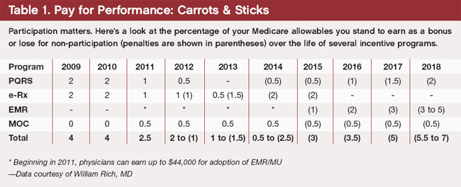 It's enough to make many ophthalmologists want to give up, or not even bother to try. But they can't. The reality is that the disappointment of not winning bonus dollars will soon be followed by something worse, as the penalties for not participating kick in over the next few years. The lack of adoption of EHR, e-Prescribing, PQRS and maintenance of certification amounts to four penalties that are additive once we reach 2017, notes William Rich, MD, medical policy director for the American Academy of Ophthalmology. “The difference in revenue for the profession is between about $220 million, the first year of these things, to about $350-$400 million in penalties down the road,” Dr. Rich says. For an individual practice, the swing could be as much as 11% of revenue of the course of the various programs. (see Table 1, below).