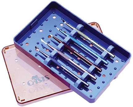 A “Tray for Day” sterilization tray from Oasis holds five knives for a full day's surgeries.