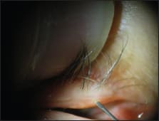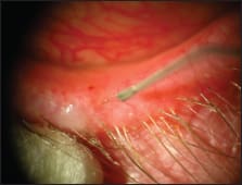 ■ Meibomian gland duct probing, a procedure to mechanically open obstructions postulated to occur at the orifice and within the lumen of the meibomian gland, is a novel approach first described by Dr. Steven Maskin (Figures 1 and 2).7 Since 2009, published reports of several small series of patients suggest a substantial percentage of patients experience subjective relief of symptoms, lasting for months. In a 2011 AAO presentation, Dr. Maskin reported 33% of original series of patients required retreatment at an average of 10 months. Challenges of this procedure include achieving good lid anesthesia for the procedure, which is somewhat uncomfortable, and also determining when retreatment is appropriate. Dr. Maskin has found his patients are well anesthetized and tolerate the procedure with the use of jojoba-containing anesthetic ointment containing 8% lidocaine. The jojoba wax esters appear to increase delivery of anesthetic into the meibomian glands.
