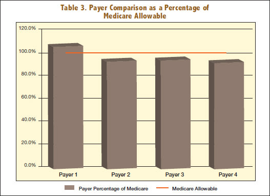 Because Medicare is the most common payer, many contracts are negotiated as a percentage of Medicare fees. Therefore, it's a good idea to set up a summary that shows reimbursement as a percentage of Medicare. Table 3 provides a graph to compare the payers as a percentage of Medicare's allowable.