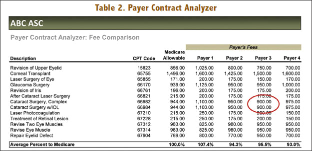 Create a spreadsheet. Set up your spreadsheet with the CPT codes and service descriptions down the left side (Table 2.) Enter Medicare reimbursement in the first column. (For most ophthalmic ASCs, the largest payer is often Medicare, making up 40-70% of an ophthalmic ASC's collections. For this reason, most other payers are measured against Medicare's performance.) In the second column, enter reimbursement rates from the next most frequent payer, and so forth.