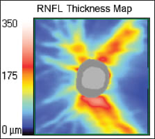 Figure 1. Characteristic superotemporal and inferotemporal RNFL defects are seen on the RNFL thickness (left) map and correspond to regions of RNFL loss on fundus photography (right). ALL OCT IMAGES COURTESY OF NATHAN RADCLIFFE, MD