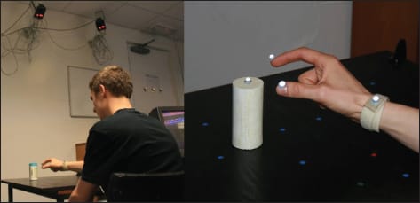 Participants in the experiment were required to reach out and precision grasp household objects placed on a table top in front of them. State-of-the-art motion capture units were used to record reflective markers placed on the participant's hand, allowing for accurate measurement of movement in three-dimensional space (Figure 2). Data from these experiments can be used to compose a comprehensive picture of a person's ability to perform this everyday task and the results suggested that patients exhibited deficits in the reaching component, making more tentative movements when reaching for the object. Interestingly, patients with inferior VF defects were particularly susceptible to errors.