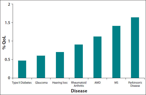 Figure 1. Graph showing the number of QOL studies (on the vertical axis) as a percentage of all studies published for seven chronic diseases over last 10 years.1 This graph suggests that there is less research in this area in glaucoma when compared to other chronic conditions.