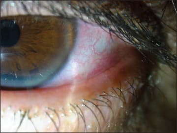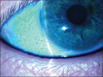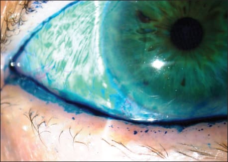 I tell patients that blinking with conjunctivalchalsis is like “jogging with loose socks” and they “get it” right away. The more movement there is, the looser the conjunctiva gets and the more rubbing and sliding of tissue occurs. This leads to more irritation and further weakening of the tissue. Another classic CChal sign seen in Figure 1 is the presence of anteroplacement of the mucocutaneous junction, seen clinically as lissamine green staining of the lid margin just under the folds of conjunctiva laterally. This constant contact between lid margin and conjunctiva causes the patients to be aware of a foreign-body sensation. This lid margin irritation may be confused with, or exacerbate, blepharitis.