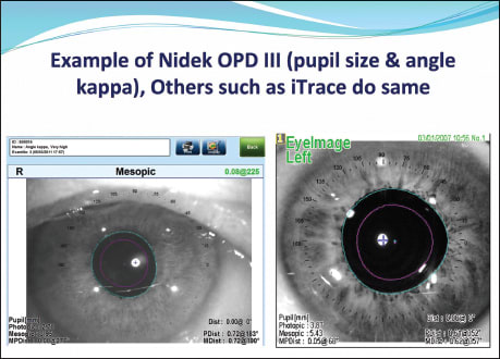 Image quality at a certain focal point typically will be best in negative SA IOLs, but depth of field is best with positive SA IOLs (Figures 2, 3). Usually, zero SA IOLs are the best happy medium in terms of image quality and depth of field. Angle kappa, or the mean displacement between the visual (foveal) and pupillary (optical) axes, is measured normally as 2-5 degrees in the horizontal axis, or as 0.36 mm (+/− 0.22) from an average of 18 studies.1 Devices such as the Marco OPDIII and Hoya iTrace can measure scotopic/mesopic pupil and angle kappa in terms of degrees or mm and are very useful diagnostic tools in the IOL decision process (Figure 4). My practice utilizes the Marco OPDIII and it captures wavefront data measured to 9.5 mm, blue light corneal topography data (placedo disk 33 rings), lenticular astigmatism details, pupil size, spherical aberration, and angle kappa in just 10 seconds per eye measurement time — all of which are very useful preoperative data with no additional chair time.