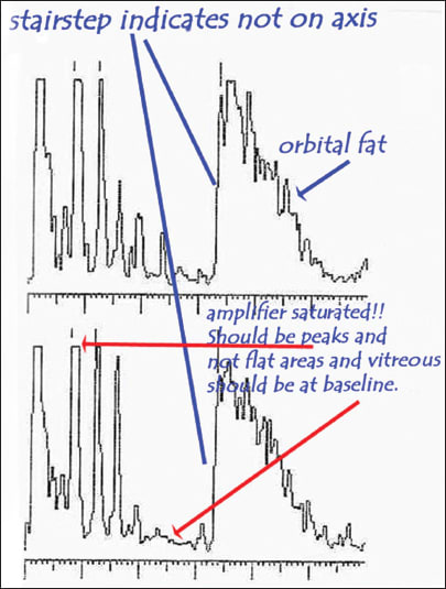 Figure 3. Stair-stepped or low-amplitude spikes suggest poor alignment with the visual axis and may be associated with errors in axial length.