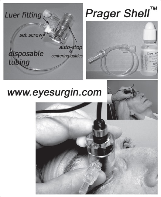 Immersion biometry may be performed with an open cylinder using a Hansen Shell (Hansen Ophthalmic Development Laboratory, Coralville, Iowa) filled with Goniosol. Alternatively, the operator may use a fixed immersion shell, the most common being the Prager Shell (ESI Inc.). Modified from a 1977 design by Jackson Coleman, MD, the Prager Shell (Figure 1) is the only one cleared by the FDA and has a patented probe auto-stop as well as a Luer fitting to facilitate changing contaminated tubing between patients.