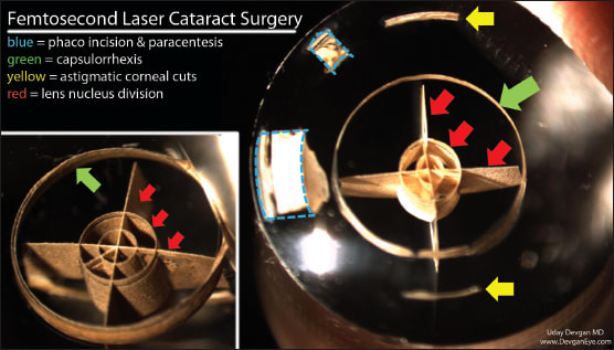 Many parts of cataract surgery can be performed with the femtosecond laser, including the capsulorhexis, corneal incisions and division of the lens nucleus (Figure 1). Precise delivery of laser energy is made possible by the guidance of an OCT image and input from an experienced surgeon. Currently in cataract surgery, the femtosecond laser is used to replace a manual part of our existing phacoemulsification procedure with a machine in the hopes of improving precision and, therefore, results.