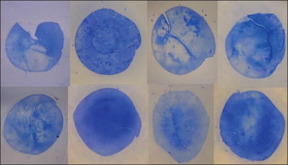 Figure 4a. Laser capsulotomy samples performed with the Catalys Precision Laser System, stained with trypan blue to demonstrate precision in size and shape. COURTESY OF OPTIMEDICA